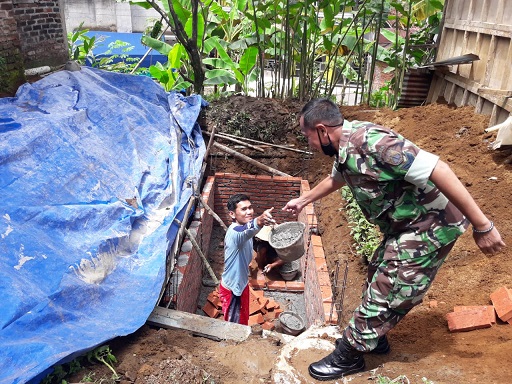Babinsa Sertu Sugeng dalam kesempatan tersebut turun langsung dengan membantu pekerja dengan mengaduk adonan pasir semen maupun menyiapkan material lainnya untuk membangun septic tank atau jamban sehat.(Koramil 01/Banjarnegara).
