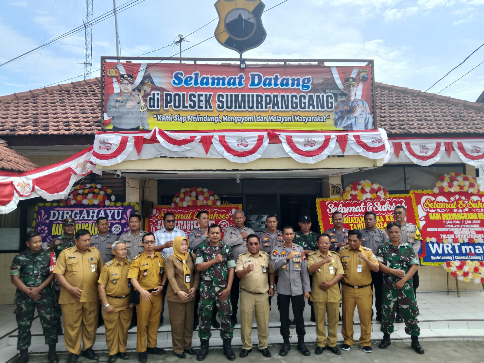 Tegal – Sebagai bentuk Sinergitas 3 Pilar, Danramil 03/Sumurpanggang Kodim 0712/Tegal Korem 071/Wijayakusuma Kapten Inf Taryoto bersama Camat Sumurpanggang Ari Budi Wibowo SH Msc berikan kue sekaligus ucapan selamat HUT