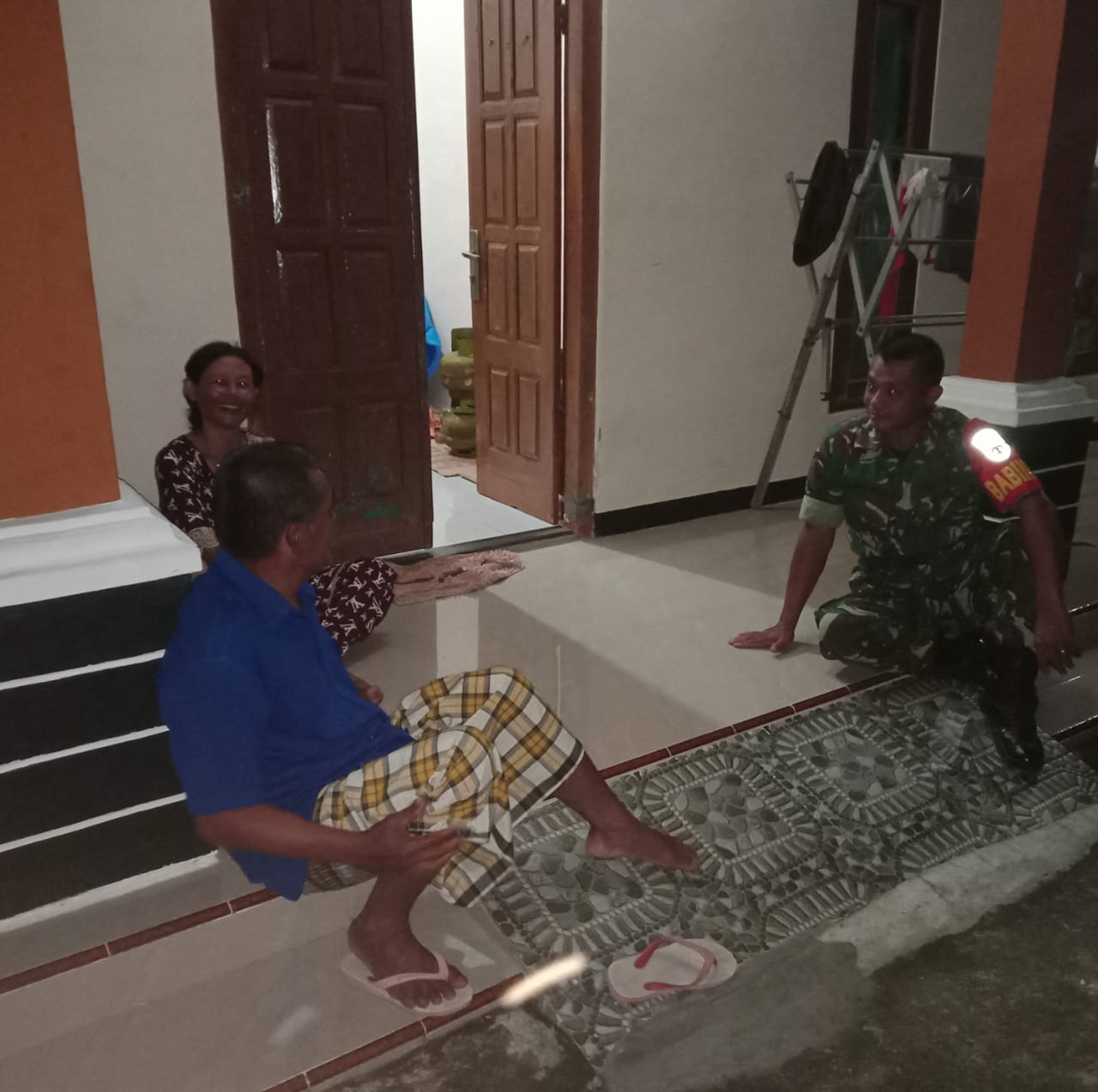 Tegal - Babinsa Koramil 05/Suradadi Kodim 0712/Tegal Serda Jayali bersama anggota Polsek Suradadi Aipda Aripin melaksanakan kegiatan patroli malam dan kegiatan komsos ke rumah warga Desa Purwohamba Kecamatan Suradadi Kabupaten