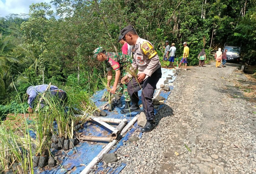 Banyumas – Mencegah longsor Koramil 14/Gumelar Kodim 0701/Banyumas Korem 071/Wijayakusuma bekerjasama dengan Polsek Gumelar, Pemcam Gumelar, BPBD Banyumas, Pemdes Tlaga dan Ormas serta masyarakat melaksanakan kegiatan penanaman ratusan rumput Vetiver yang terletak di grumbul Legok Desa Tlaga Kecamatan Gumelar Kabupaten Banyumas. Senin 29/01/2024.