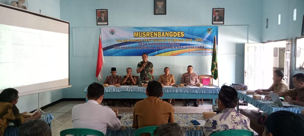 Banjarnegara – Danramil 07/Mandiraja Kodim 0704/Bna Korem 071/WK Kapten Kav Eman Kusnadi menghadiri Musrenbangdes (Musyawarah Perencanaan Pembangunan dan Pengarahan Stanting yang dilaksankan diaula Balai Desa Mandiraja Wetan Jum’at (26/07/2024).