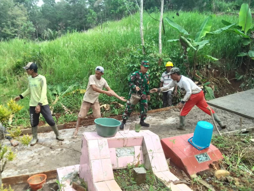 Cilacap – Serda Pandu Iriyanto Babinsa Koramil 14/Cimanggu, Kodim 0703/Cilacap, Korem 071/Wijayakusuma, melaksanakan karya bakti pengecoran jalan di komplek pemakaman umum Dusun Tameng RT. 01 RW. 07 Desa Bantarpanjang, Kecamatan Cimanggu, Kabupaten Cilacap, Rabu (31/01/2024).