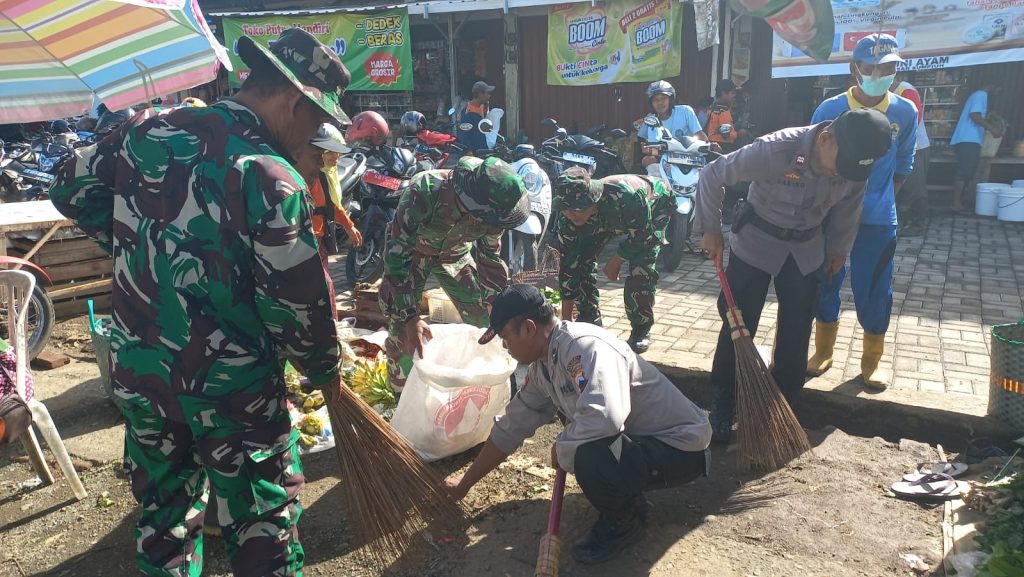 Banyumas – Menyambut hari juang TNI-AD ke-78 tahun 2023, Kodim 0701/Banyumas bekerja sama dengan Forkopincam Sumpiuh, Brimob Kroya, DLH Sumpiuh, PU Sumpiuh, Pramuli Sumpiuh, MDMC Sumpiuh dan masyarakat setempat menggelar kegiatan karya bakti pembersihan pasar  tradisional sumpiuh Kabupaten Banyumas. Kamis 14/12/2023.