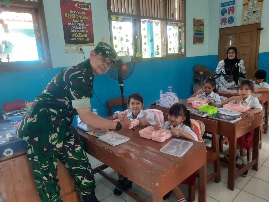 WS. Danramil 14/Gumelar Letda Inf Amat Barokah saat mendampingi puluhan siswa-siswi untuk menikmati makanan bergizi bersama sembari memberikan sosialisasi tentang pentingnya makanan sehat dan bergizi.