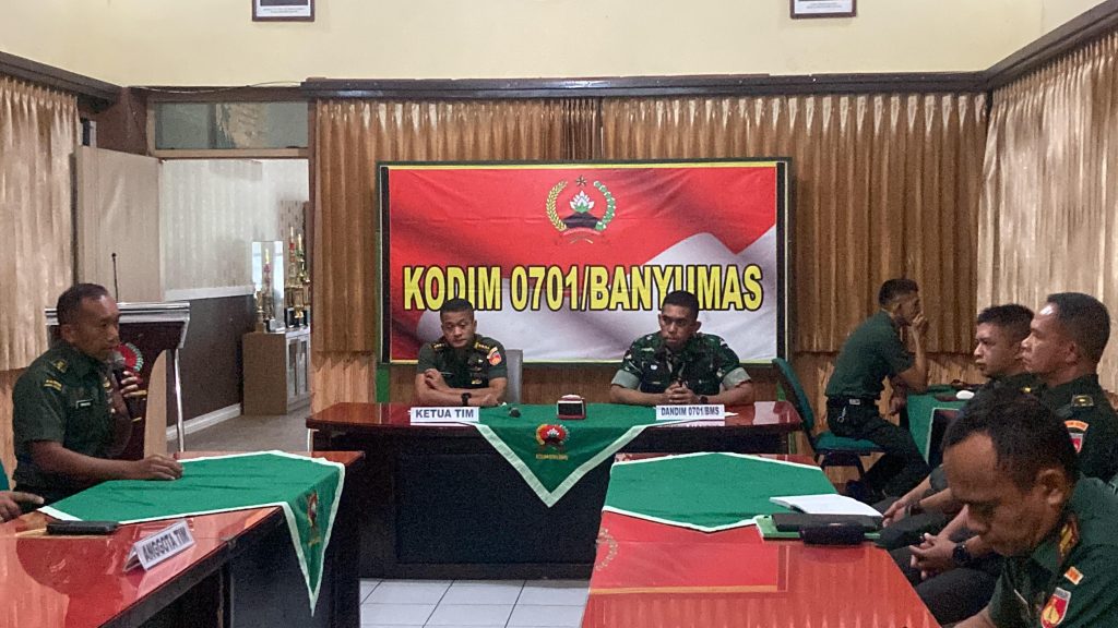 Banyumas – Tim Inspektorat Kodam IV/Diponegoro dibawah pimpinan Kol Kav Ari Setyawan Wibowo, S. Sos, (Ketua Tim) melakukan kegiatan pengawasan audit kinerja TW 1 Tahun 2025 ke Kodim 0701/Banyumas, kedatangan Tim Wasrik disambut langsung oleh Komandan Kodim 0701/Banyumas Letkol Arm Ida Bagus Adi Purnama, S.T., M.Han, Kasdim dan Perwira staf Kodim di Ruang data Kodim 0701/Banyumas jalan Jenderal Soedirman No. 204 Kelurahan Kedungwuluh Kecamatan Purwokerto Barat Kabupaten Banyumas. Selasa (18/03/2025).