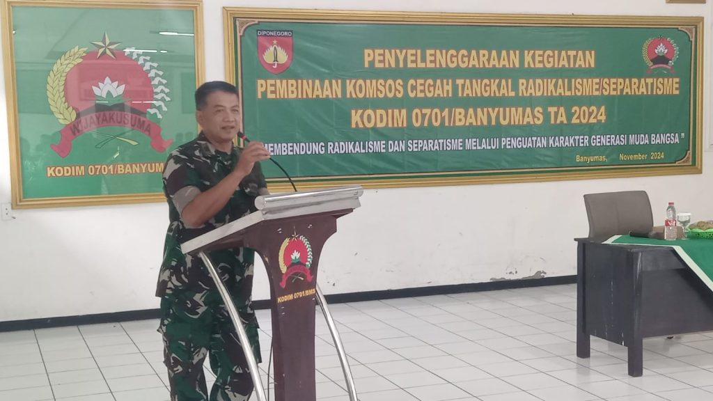 Banyumas – Dengan mengusung tema “Membendung Radikalisme dan Separatisme Melalui Penguatan Karakter Generasi Muda Bangsa”, Kodim 0701/Banyumas menggelar kegiatan Pembinaan Komunikasi Sosial (Komsos) Cegah Tangkal Radikalisme/Separatisme di Aula Jenderal Soedirman Kodim 0701/Banyumas Jln. Jenderal Sudirman No. 204 Kelurahan Kedungwuluh Kecamatan Purwokerto Barat Kabupaten Banyumas, Kamis (14/11/2024).