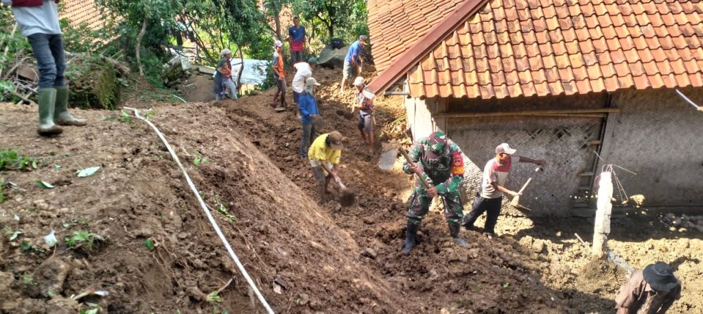 Terkait kejadian tersebut, Danramil 14/Cimanggu Kapten Inf Wahyulianto memerintahkan anggotanya untuk melaksanakan kegiatan Karya Bakti bersama warga, guna membersihkan material longsor, Kamis (08/02/2024).