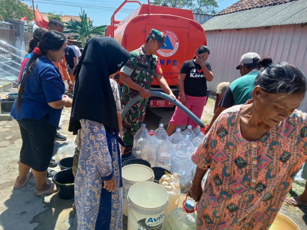 Tegal – Babinsa Koramil 05/Suradadi, Kodim 0712/Tegal, Korem 071/Wijayakusuma Serda Kasmuri malaksanakan Pendampingan penyaluran bantuan air bersih dari BPBD Kabupaten Tegal sebanyak 1 tangki dengan kapasitas 4000 liter yang dibagikan kepada warga Dukuh Gemahsari RT 2 RW 4 Desa Jatimulya Kecamatan Suradadi Kabupaten Tegal. Selasa (13/8/2024)